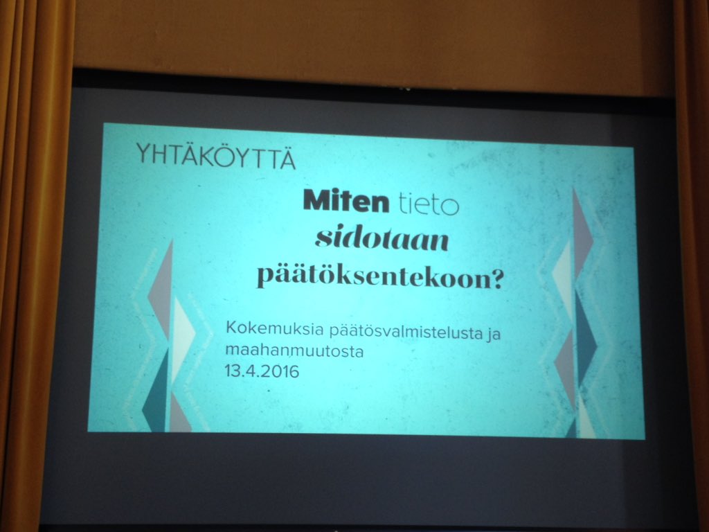 Yhtäköyttä-hankkeen kokeilut kiinnostivat Tutkijoiden ja päätösvalmistelijoiden yhteisiä tietotyön käytäntöjä pohdittiin THL:n, Oxford Research Oy:n ja Open Knowledge Finlandin toteuttaman Yhteiset tietokäytännöt tutkimuksessa ja päätöksenteossa -hankkeen tilaisuudessa Balderin salissa 13.4.2016 (ohjelmarunko). Paikalla oli lähes seitsemänkymmentä tutkijaa, tiedeviestijää, virkamiestä sekä muuta kiinnostunutta, jotka olivat saapuneet paikalle kuulemaan hankkeen tiedon hyödyntämisen kokeiluista sekä edistämään yhdessä kokeiltujen käytäntöjen ja välineiden […]