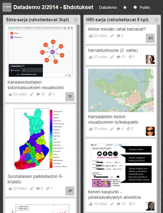 Tämä on rinnakkaispostaus alkuperäisestä Datademo-tiedotteesta Datademon kevätkierroksen eilen maanantaina illalla päättyneessä äänestyksessä valittiin rahoitettavaksi kahdeksan avointa dataa hyödyntävää ideaa. Pääkaupunkiseudun sarjan ääniharava oli Helsingin verovarojen käyttöä havainnollistava “Minne meidän rahat katoavat”. Kansallisen sarjan ykköspaikan jakoivat ehdotukset kansanedustajien sidonnaisuuksien visualisoinnista ja kotimainen paikkatietokirjasto R-laskentakielelle. Datademorahoituksessa osallistujat päättävät itse miten julkinen raha käytetään Datademon ideakuulutuksessa huhtikuun […]
